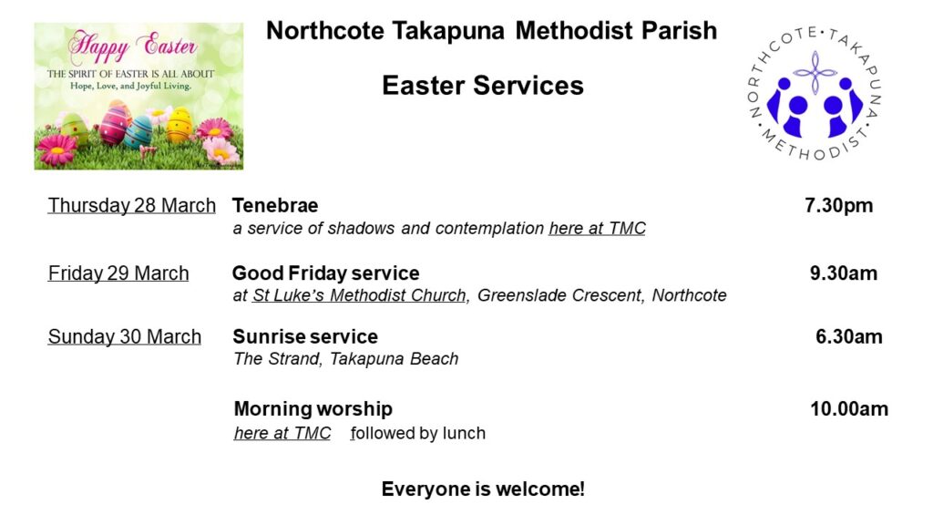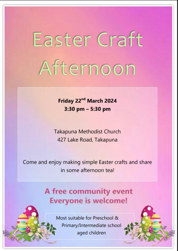 All are welcome to our children’s Easter craft afternoon followed by a community picnic under the Puriri tree. The craft afternoon includes take home crafts for children of primary school age (plenty of ride ons and toys for younger ones) and afternoon tea. Celebrating 15 of Neighbours Aotearoa which started here at TMC, the picnic will include a sausage sizzle, bouncy castle, ice-cream and a collaborative art project. Help us celebrate the end of summer with your neighbours at this free community event.